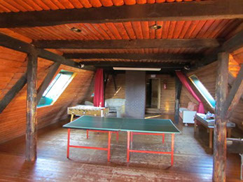 Der erhöhte Teil des Raumes eignet sich als Bühne für Theaterspiele oder musikalische Aufführungen. Auch eine Tischtennisplatte sowie ein Kicker sind auf dem Spielboden vorhanden.
